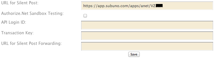 (a) Open your Subuno Integrations page and find the Authorize.Net section. You will see the following.