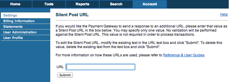 (b) In another window/tab, log into your Authorize.Net account and navigating from the Authorize.Net Home Page --> Account Tab --> Silent Post URL.