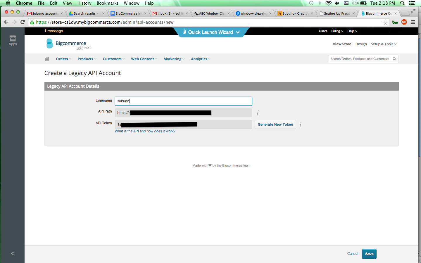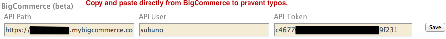 Now go to app.subuno.com/account/integrations. Copy and paste the username, API Path, and API Token for the user you just created into the BigCommerce section of the page and save.