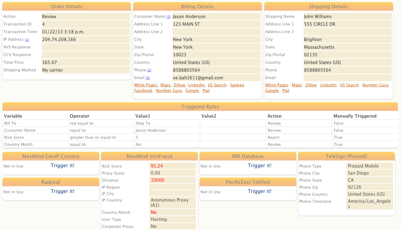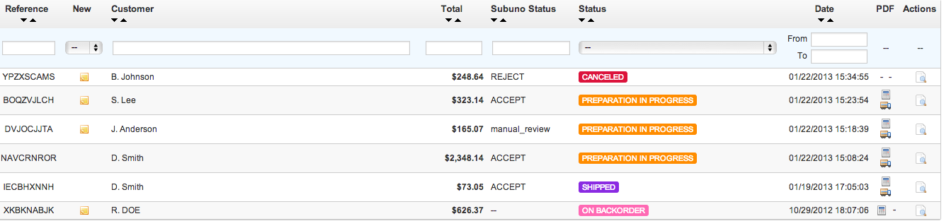 Get notified either through email alerts or Prestashop admin panel when there is a suspect order. Create Subuno rules to automatically check things that you normally would do manually. For example, review orders with high dollar amounts, overnight shipping methods, repeat bad customer, high risk shipping countries, etc. For additional protection, you can also screen orders using popular fraud prevention services, like MaxMind and Telesign, that have been integrated into the Subuno platform.