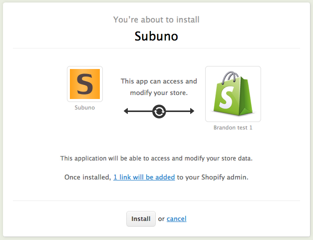 You may be asked to log into Shopify then to confirm installation of the Subuno app.