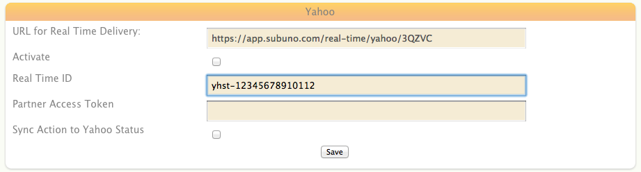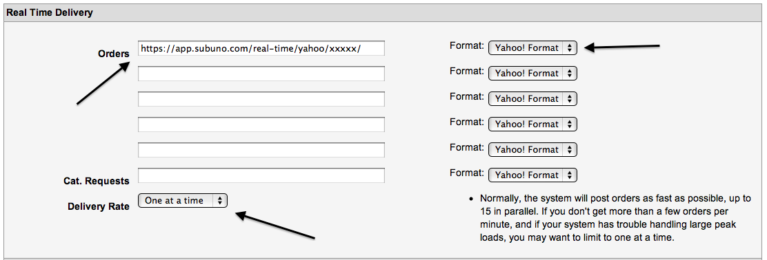 Go to your Subuno Integration page and enter your Yahoo Store ID (e.g. "yhst-12345678910112" or "acmestore" for legacy users). Then copy the entire URL from the "URL for Real Time Delivery" field.
