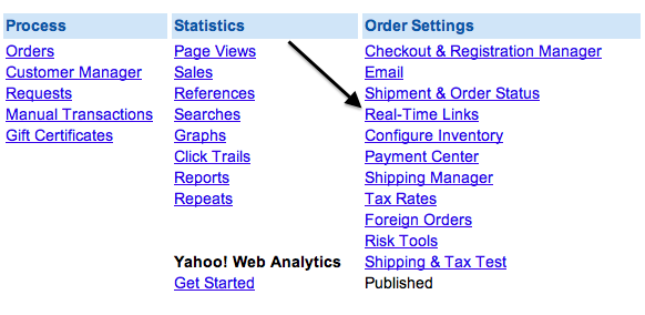 In a separate window or tab, go to your Yahoo Store Manager and under Order Settings, click on Real-Time Links and then Real-Time Links Settings.