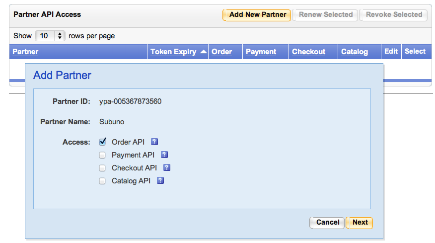 Go back to Real-Time Links Settings and click on API Settings. Then click on "Add New Partner" and enter Subuno's Yahoo Partner ID (ypa-005367873560) and check off "Order API".