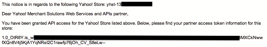 Once you accept the Yahoo terms, you will receive an email from ms-partner@yahoo-inc.com giving you a unique security partner access token. It is long and looks something like the following: